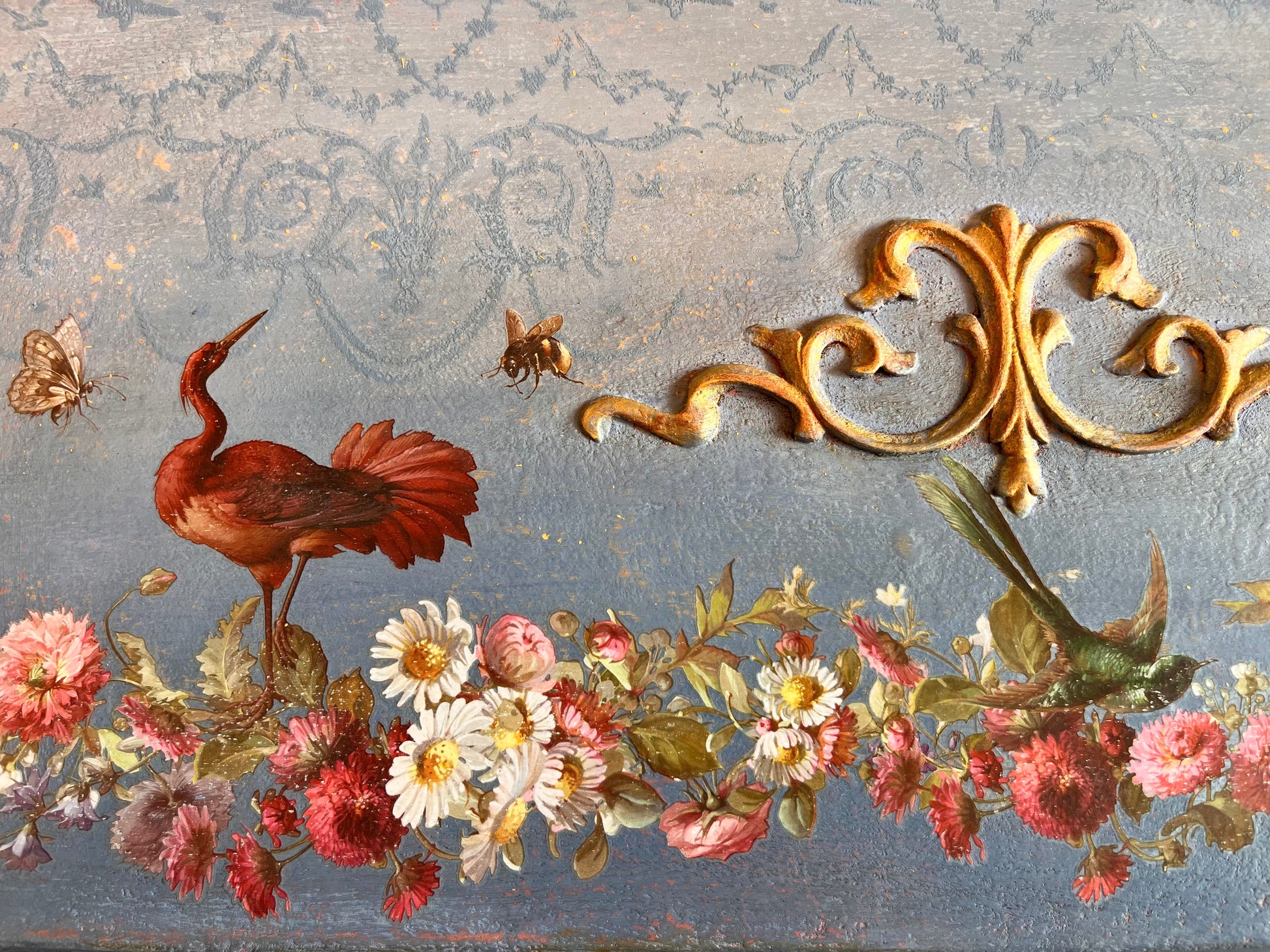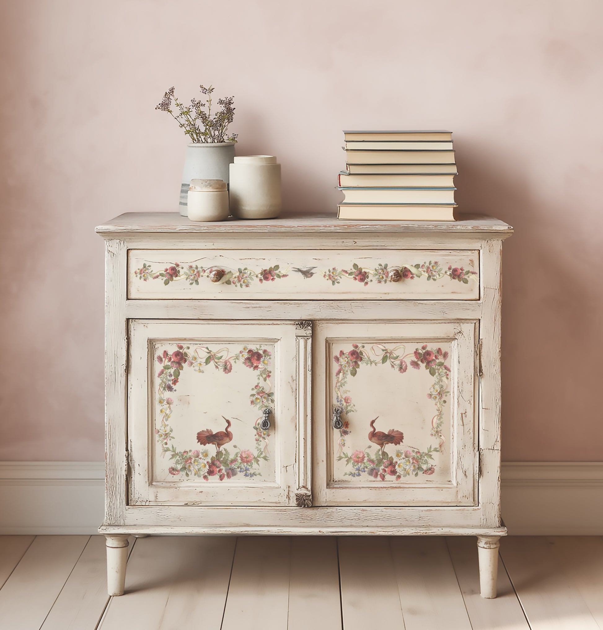 Designed with both small décor and furniture scale in mind, Madeleine includes corners, borders, drawer-backer motifs, and full bouquets that can stand alone as focal elements. Many of the arrangements come directly from the antique artwork exactly as they were found, offering lavish compositions that feel feminine, expressive, and beautifully over the top. Whether placed on a tray, a chest of drawers, or a curated vignette, Madeleine captures the indulgent beauty of historic French interiors in a way that invites bold, elegant creations.